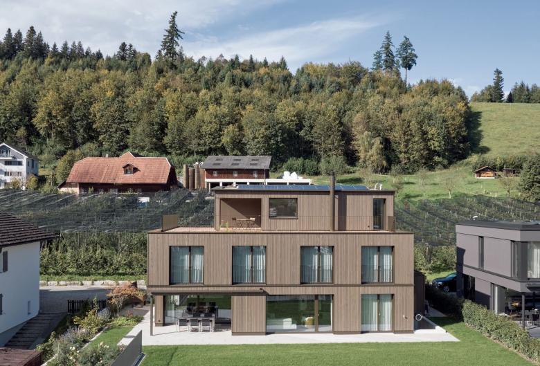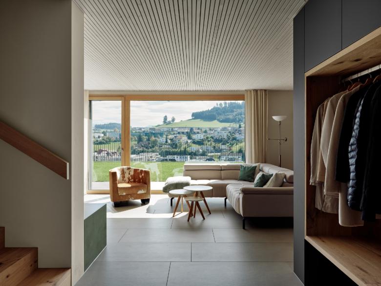 Als Inhaber eines regionalen Holzbauunternehmens ist die Bauherrschaft stark mit dem Werkstoff Holz verbunden. Das gesamte Gebäude wurde in Holzbauweise erstellt. Die natürliche und nachhaltige Materialisierung gibt dabei dem Gebäude seinen eigenen, ausdrucksstarken Charakter mit viel wohnlichem Charme.