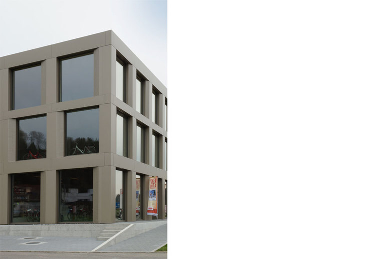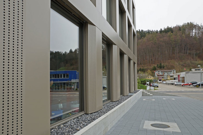Das Gebäude lebt von der speziellen Fassadengestaltung und deren Details. Die Tragkonstruktion wird mit einer vorgehängten Metallfassade verkleidet, welche aus bronzefarbigen, verdeckt befestigten Aluverbundplatten besteht. Die geschossweise versetzten Lüftungsflügel wurden mit gelochten Platten abgedeckt. Durch diese gestalterische Massnahme konnte auf einfache Weise ein lebendiges, einprägsames Fassadenbild erzeugt werden.