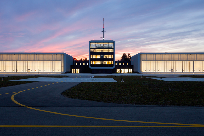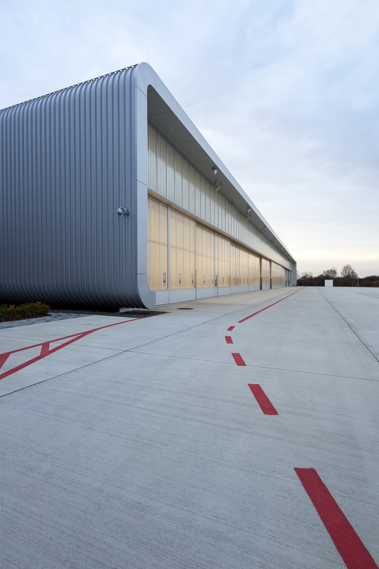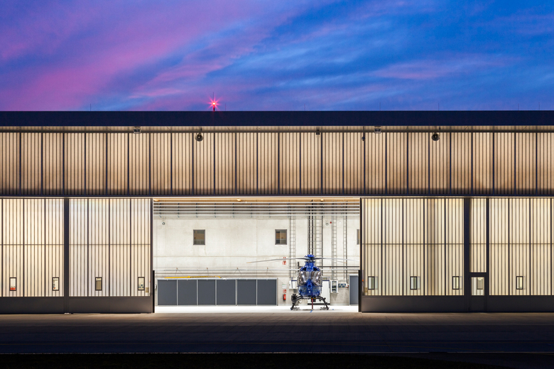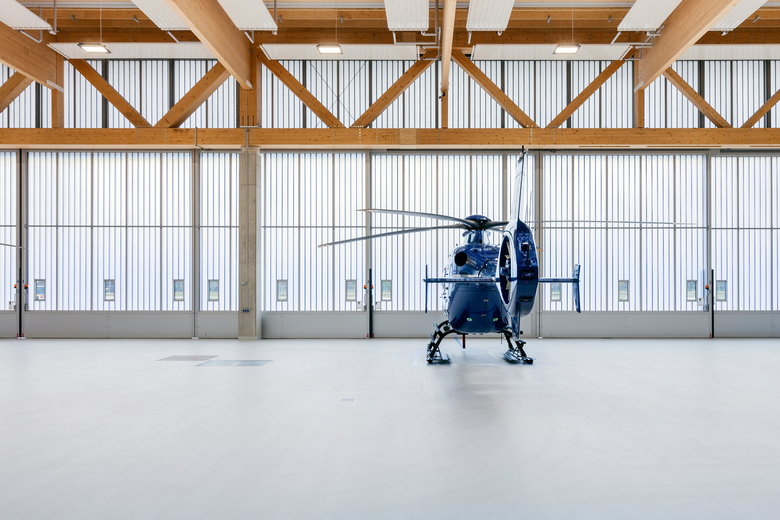 Der ca. 250m lange Baukörper besteht aus Hubschrauber-Abstell- und Wartungshallen mit Waschhalle, zugehörigen Werkstätten mit Krananlage, Lager- und Büroflächen. Im Endausbau mit Landespolizei wird das Gebäude eine Länge von 355m aufweisen.