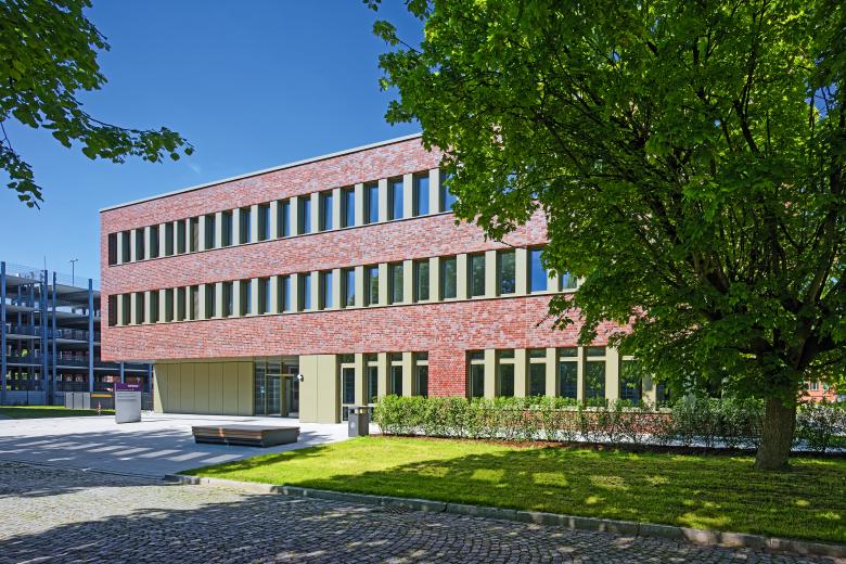 Der Neubau Mathematik markiert mit seiner kompakten Baukörperform den Übergang von der Campusmagistrale zum Wissenschaftspark. Gleichzeitig bildet das dreigeschossige Gebäude den nördlichen Abschluss des Heinrich-Hecht-Platzes. Mit seinem architektonischen Ausdruck fügt sich der Neubau in den bestehenden Kontext ein.