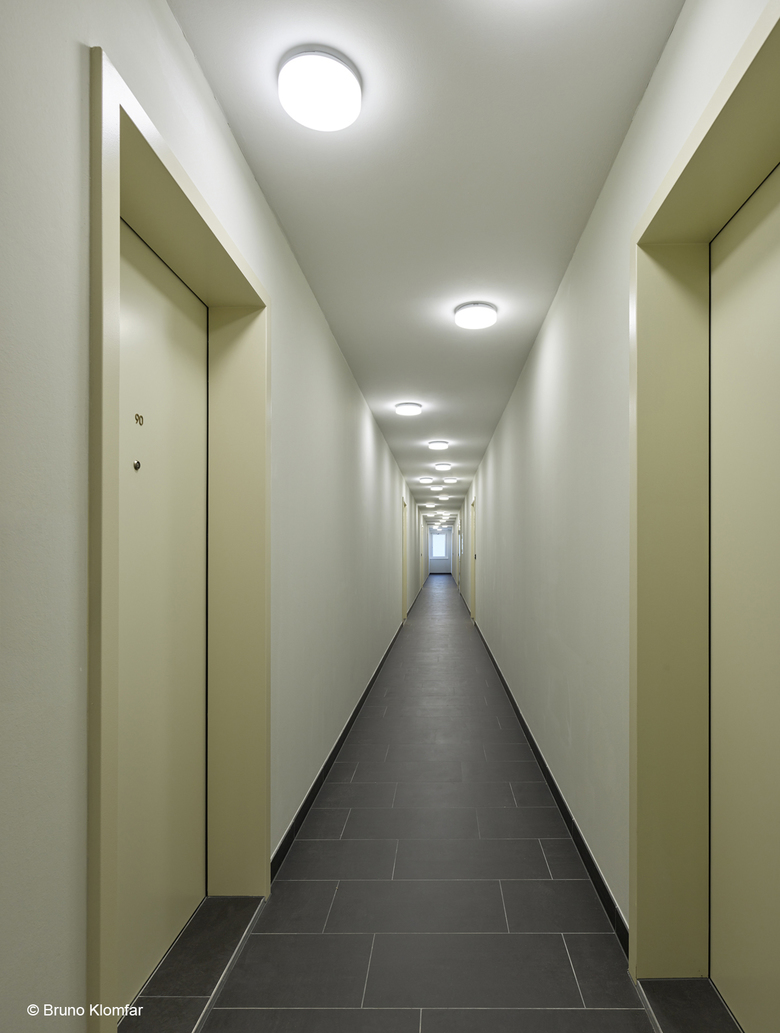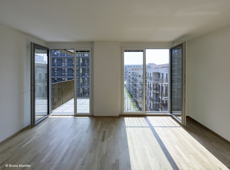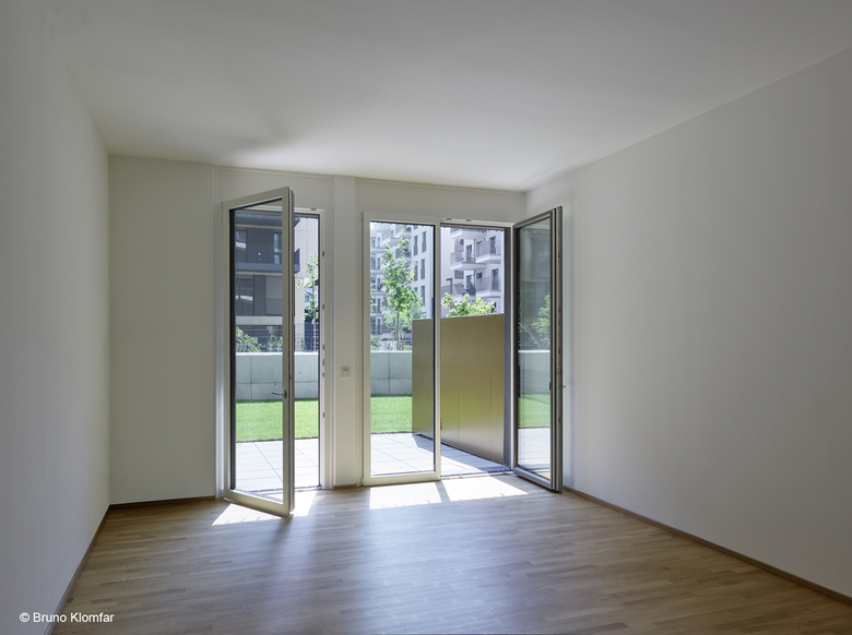 The building units at Erdberger Lände 26 “North” stand at a clear right angle along Erdberger Lände and the neighborhood of Henkel-Werke. They open up in a form of a park to the southwest. A commercial area and garage entrances are oriented towards the Lände, whereas the ground floor apartments with private gardens and children's playgrounds are oriented towards the open courtyards.