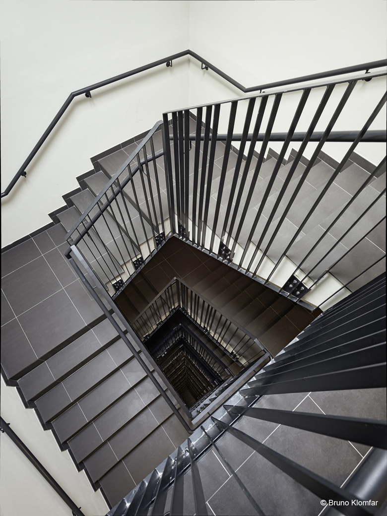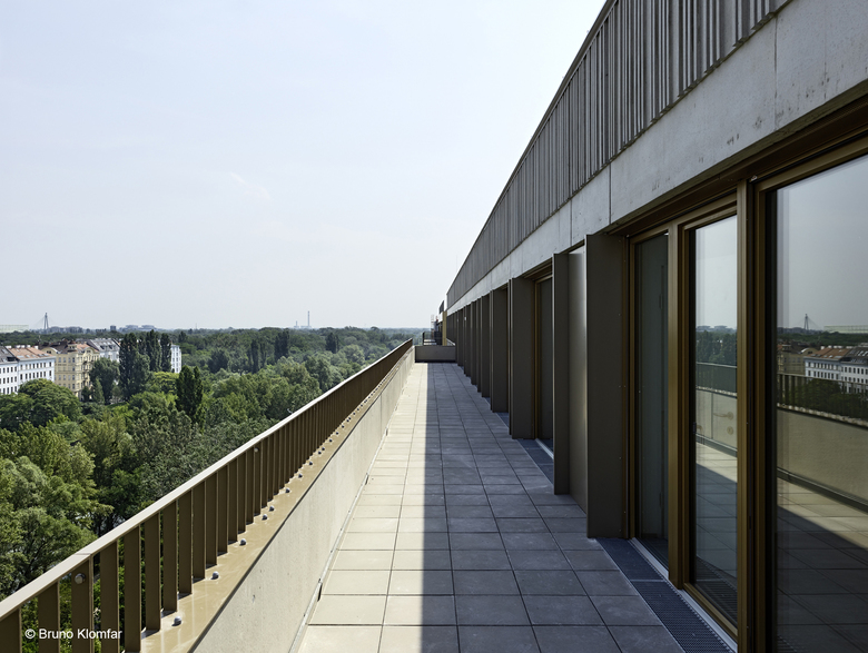 The ensemble of towers comprises 269 apartments which range from 41 to 154 square metres in size, i.e. consist of one to five bedrooms. Thus, the coexistence of a variety of family forms and life styles in the new district is possible. Each apartment has a separate open space in the form of balconies, loggias or terraces. Of particular note are two and three-storey maisonettes with larger and smaller gardens, positioned south and southeast. As a result, high quality, lively living spaces are created on the ground floors facing away from the street. The apartments are connected via naturally illuminated walkways. The complex comprises 156 underground parking spaces in a 1-storey underground car park.