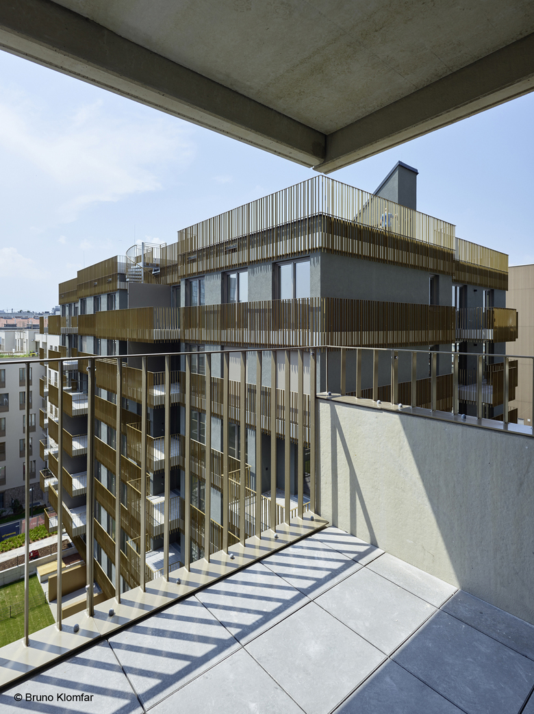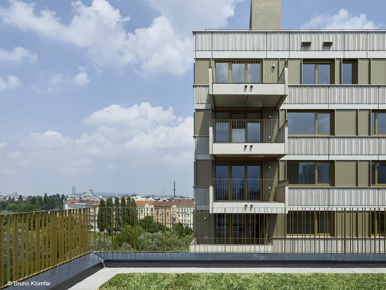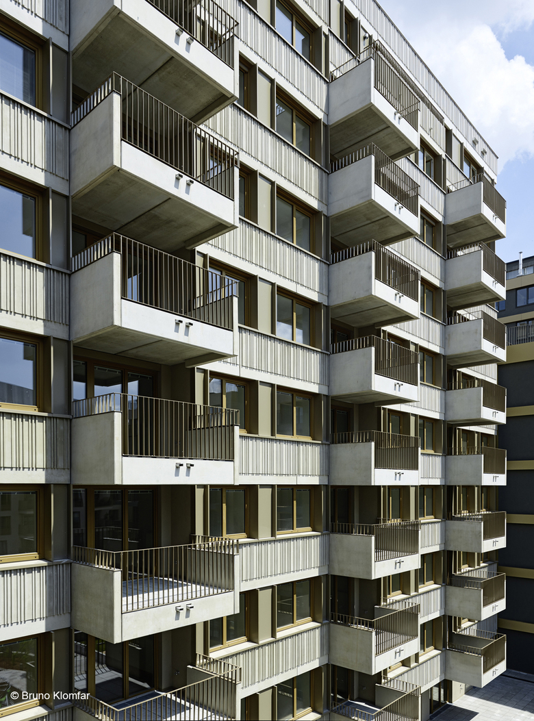 The building unit facing the Canal and the street Erdberger Lände appears as a woven structure with vertically arranged window frames. It features bright, irregularly spaced bands with pre-cast concrete components. Anodised aluminum window frames incorporated into the gaps between these bands create playful shadows to add a dynamic expression on the facade. Another structure features continuous railing made of shiny, powder-coated flat steel, which contrasts the dark background covered with thermal insulation facade with floor to ceiling windows.