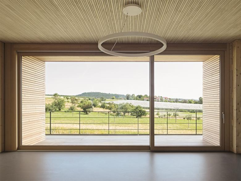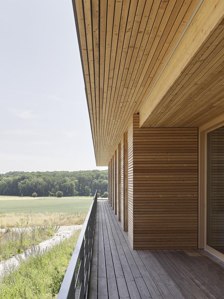 Holz als wesentlicher Baustoff bestimmt die Erscheinung sowohl im Äußeren wie auch im Inneren des Gebäudes. Die tragenden Bauteile wurden aus Massivholzwandelementen und aus Lignatur Hohlkörperdecken erstellt. Die bewitterten Fassadenflächen aus Lärchenholz erhielten einen dunkleren Lasuranstrich, die wettergeschützten Bereiche sowie alle Holzflächen im Inneren bleiben unbehandelt und erhalten damit ihren naturbelassenen Ausdruck. Die Wand- und Dachelemente wurden vorgefertigt und oberflächenfertig angeliefert und in sehr kurzer Zeit auf der Stahlbetondecke des Sockelgeschoßes montiert. Holzfenster ergänzen dieses nachhaltige Gebäudekonzept. Auch die Haustechnik orientiert sich daran – Fußbodenheizung, dezentrale Lüftungsgeräte mit Wärmerückgewinnung und eine Photovoltaik-Anlage über die gesamte Dachfläche sowie eine Wärmepumpe sind die Bestandteile einer energiesparenden Gebäudetechnik.