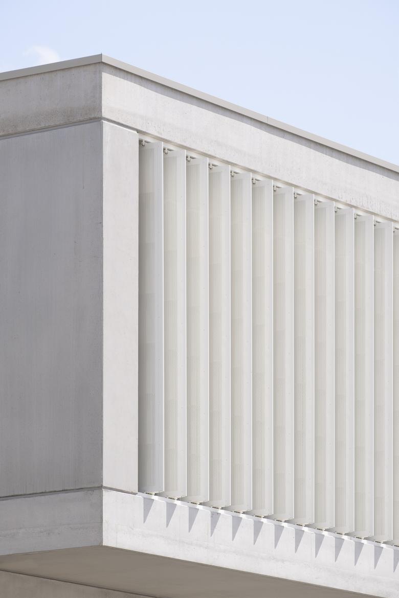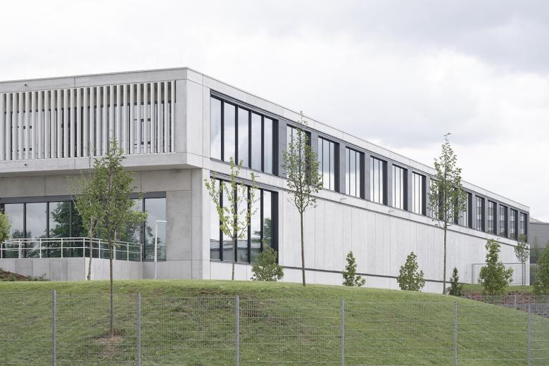 Der Gebäudekomplex besteht aus drei Hallenteilen mit vorgelagerten Bürobereichen. Die Büro-/Sozialräume, Empfang und Casino sowie Technikräume sind jeweils in zweigeschossigen Kopfbauten auf der Westseite der Hallen angeordnet. Die Räume im Obergeschoss besitzen durch eine Ganzglaswand eine Sichtverbindung zur Halle, welche auf direktem Weg über eine offene Treppe erreicht werden kann. Die äußere Erschließung erfolgt über die Raiffeisenstraße an der Westseite mit Zu- und Abfahrten für Anlieferverkehr an je zwei Überladebrücken und einer Rampe zu einem ebenerdigen Tor pro Halle. Der Stichweg aus der Siemensstraße erschließt die Ostseite des Grundstücks mit Hof und ebenerdigen Toren. Die Fassade der Hallen besteht aus Sichtbeton-Sandwich-Elementen und Isopaneelen in dunklem Farbton. Großflächige Verglasungen an den Außenseiten erzeugen helle Hallen-Innenräume.