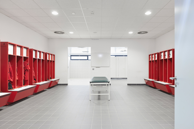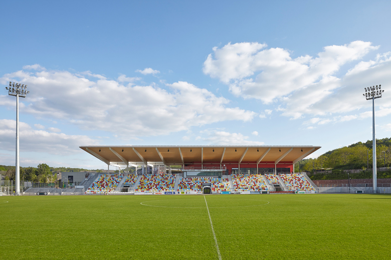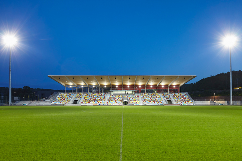 Für die Tribünenanlage wurde ein rechteckiger Grundriss gewählt, der sich nach Süden zur Straße hin geschlossen und nach Norden zu den Spielfeldern hin offen präsentiert. Um den Dialog zwischen dem Foyer bzw. dem Zuschauerbereich des Tribünengebäudes und dem öffentlichen Platz zu verstärken, wurde die geschlossene Fassade des Gebäudes an der Eingangsseite in eine Lamellenstruktur aufgelöst. Dies ermöglicht es dem Körper seine klare Geometrie zu behalten, ohne den Stadtraum zu beengen und gleichzeitig öffnet es die Sichtbeziehung zwischen dem Zuschauer und dem städtischen Raum.