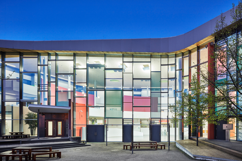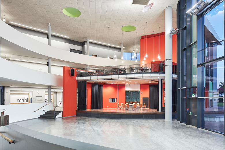 Die Schule ist in 3-geschossige Einzelhäuser gegliedert, die über eine gemeinsame Halle erschlossen sind. Die Halle ist das Herz der Schule. Hier bietet sich Raum für gemeinschaftliche Aktivitäten wie das gemeinsame Essen und für Gruppenarbeiten, aber auch ruhige Rückzugsbereiche für Einzelarbeit und Ruhephasen.