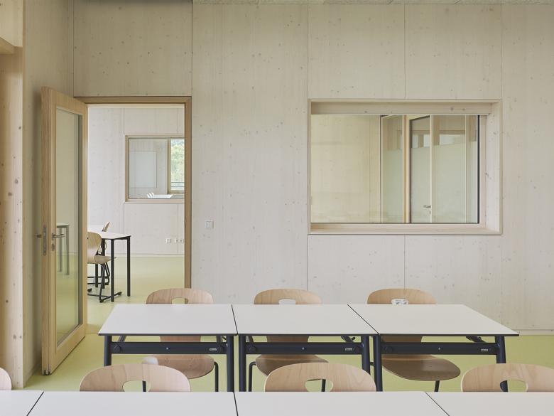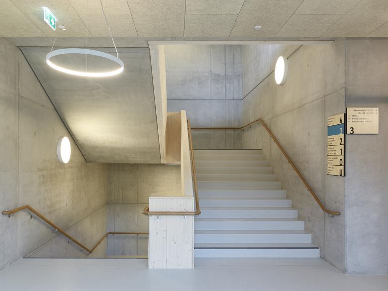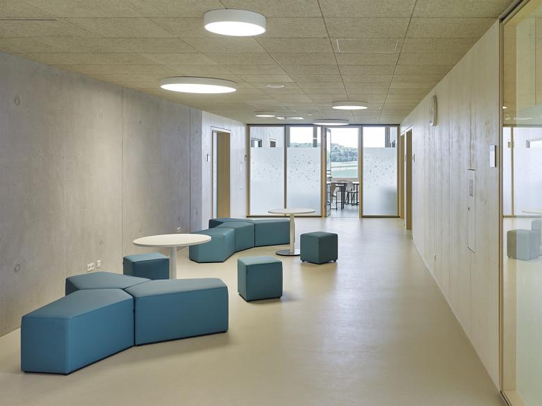 Das pädagogische Raumkonzept basiert auf dem Modell „Klassenraum Plus“: Klassenzimmer teilen sich jeweils einen Differenzierungsraum mit Sichtbeziehung. Großzügige Flure mit offenen Lernlandschaften und flexible Raumzonen ergänzen das Angebot.