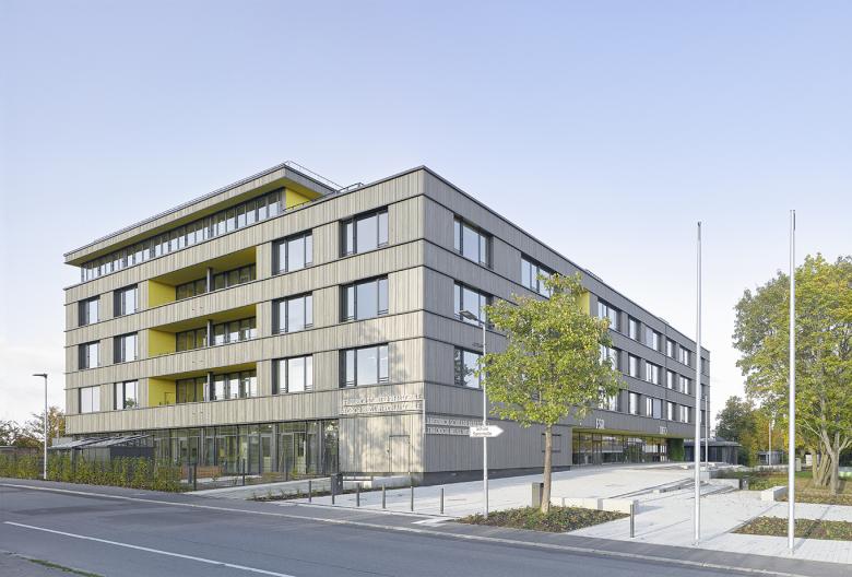 Das Schulzentrum wurde in Holzhybridbauweise errichtet: Während Sockel- und Erdgeschoss sowie die Treppenkerne in Stahlbeton ausgeführt sind, bestehen die Obergeschosse aus vorgefertigten Massivholzelementen (Brettschichtholzdecken, Brettsperrholzwände). Über 2.900 m³ Holz kamen zum Einsatz. Die hohe Vorfertigung ermöglichte eine trockene, schnelle Bauweise und reduzierte die Bauzeit erheblich.