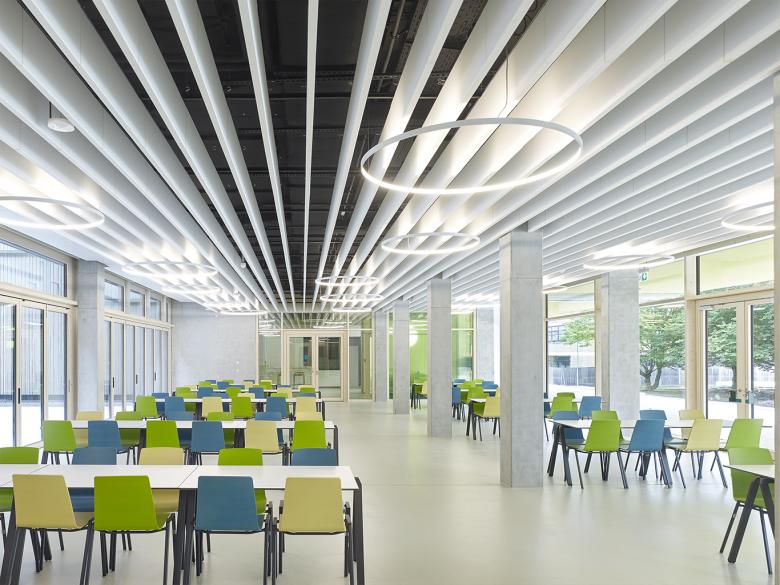 Neben 45 Fachräumen – darunter Musikräume, Lehrküchen, und Naturwissenschaftsbereiche – bieten begrünte Loggien und der Dachgarten im 4. Obergeschoss Raum für Kommunikations-, Lern- und Rückzugsbereiche. Ein Schulgarten direkt an den Lehrküchen sowie ein multifunktionaler Werkhof zwischen Neubau und Bestandsmensa erweitern die pädagogischen Möglichkeiten auch im Außenraum.