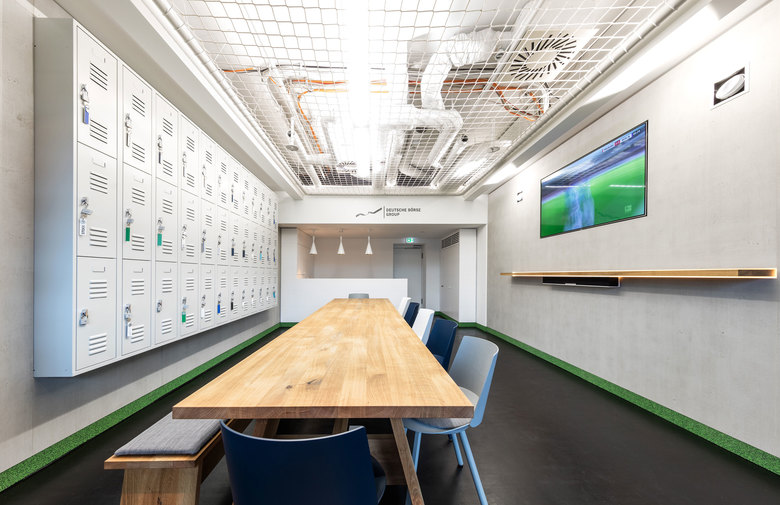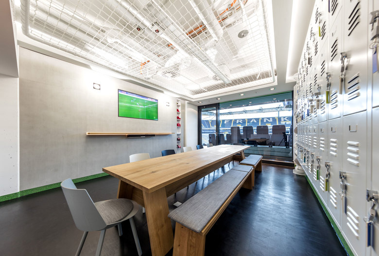 Das Konzept ist denkbar einfach und funktional. Die Besucher sollen sich wie die Profis in der Umkleide fühlen. Spinde an der Wand halten die richtige Ausrüstung für die Fans bereit. Eine Medienwand sorgt bei unübersichtlichen Szenen auf dem Spielfeld für ausreichend Durchblick und für Analysen in der Halbzeit. Wer will, kann das Spiel natürlich auch hautnah draußen auf den Logenplätzen genießen. Versorgt werden die Gäste über die Pantry-Küche im Eingangsbereich. Getafelt wird an einem langen Eichenholztisch mit den Stühlen im Corporate der Börse. Über allem schwebt als Deckensegel das Eckige, in das ja bekanntlich das Runde rein muss.