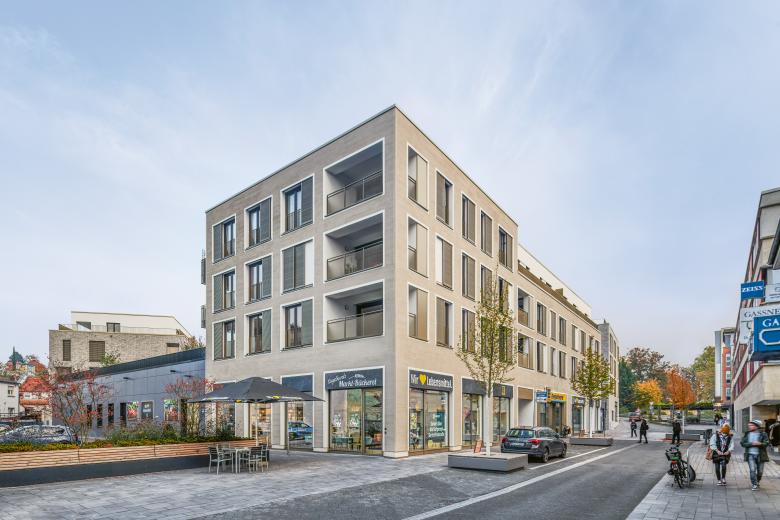 Nutzungen verdichten, das Leben in all seinen Facetten bedienen: Das Wohn- und Geschäftshaus mit einer Mischung aus 56 Wohnungen und Gewerbe schafft hochwertigen Lebensraum, der sich dabei mit einer differenziert gestalteten Fassade in die innerstädtischen Strukturen fügt.