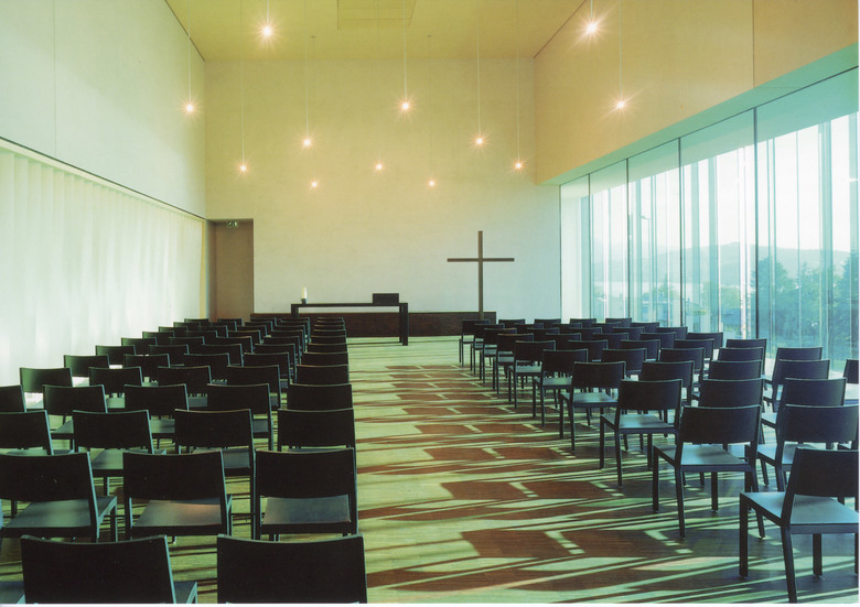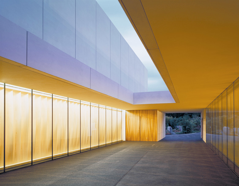 Unter einem gefalteten Dach vereint das Friedhofgebäude Räume unterschiedlichster Nutzung. Zwischen der parallel zum Hang angeordneten Abdankungshalle und den bergseitig teilweise ins Terrain eingegrabenen Aufbahrungs- und Diensträumen liegt ein sich über die gesamte Gebäudetiefe erstreckender Eingangshof. Diesem kommt eine besondere Bedeutung zu: Als von Wänden und Vorsprüngen begrenzter Aussenraum weitet er sich mit seiner Öffnung gegen den Himmel ins Unendliche. Als Passage verkörpert er den Übergang von der irdischen Welt ins Reich der Toten. In der Gebäudemittelachse liegend dient der gefasste Eingang zum Friedhof auch als Besammlungsort der Trauergemeinde bei Abdankungen. In der Querachse gelesen bildet er eine Art Fuge zwischen den Raumschichten, die von den Katafalken über den Innenhof bis zu den Glaslamellen der Talfassade reichen. Die mit verdrehten Holzlamellen nach einem Entwurf des Künstlers Hugo Suter angereicherte Glasschicht auf beiden Längsseiten des Innenhofes ist ebenso differenziert gestaltet wie die raumhaltige, grossformatige Öffnung des Abdankungsraumes zur Landschaft mit ihren frei stehenden, zueinander abgedrehten Glaslamellen. Insgesamt entsteht eine reichhaltige Sequenz unterschiedlich ausgestalteter Filter- und Schwellenräume.
