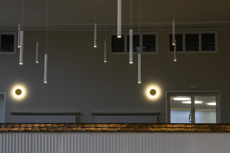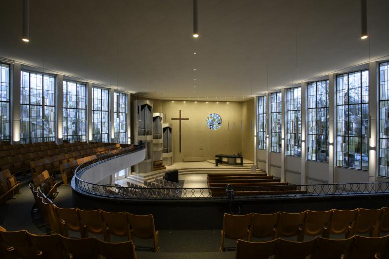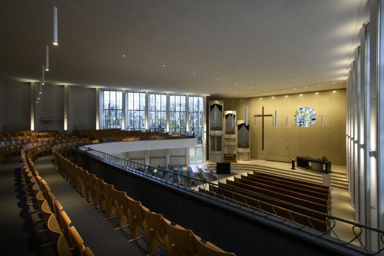 Nach nunmehr 65 Jahren Nutzungsdauer wurde das Bauwerk im Rahmen einer umfassenden Sanierung und Modernisierung – in enger Abstimmung mit dem zuständigen Denkmalschutzamt – erneut an den zeitgemäßen Gemeindebetrieb angepasst. Notwendige Einbauten wurden sensibel in die bestehende Innenarchitektur und Raumkonfiguration integriert. Hier sind vor allem die neuen Familienräume im Erdgeschoss zu nennen.
