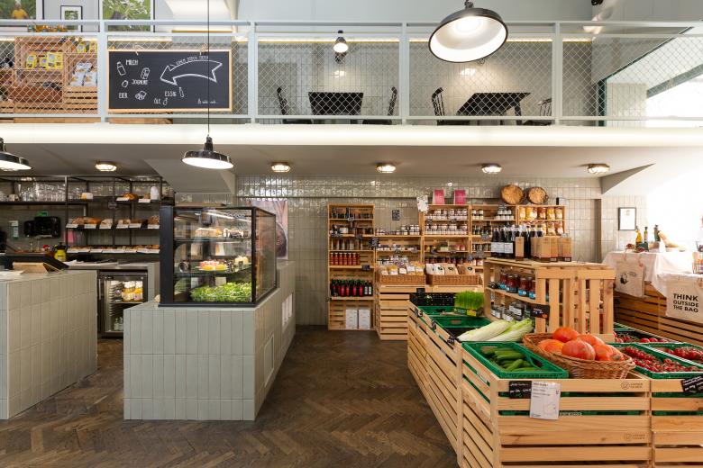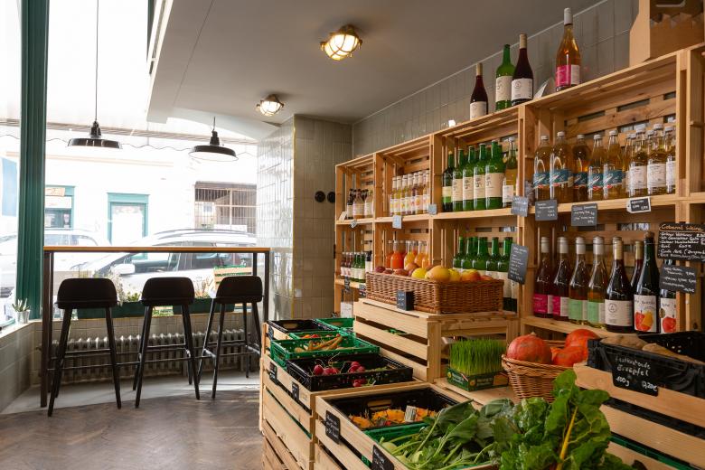 Vienna’s market gardeners produce fresh, seasonal fruit and vegetables every day. This flagship store, located close to the Naschmarkt in Vienna’s centre, aims to reinforce and promote their brand. The goods sold here are fresh products delivered daily by Vienna’s market gardeners and special baked goods and dairy products. The 120m2 shop is located in a historic listed building. The entire space is clad with tiles: crisp light green on the upper floor, and white in the dairy zone on the ground floor. A practical modular system made of light-brown wood crates is used for stacking the goods. This concept was developed by Neumann, a small Austrian company that creates ecological packaging solutions and whose customers include the Sacher Corporation.