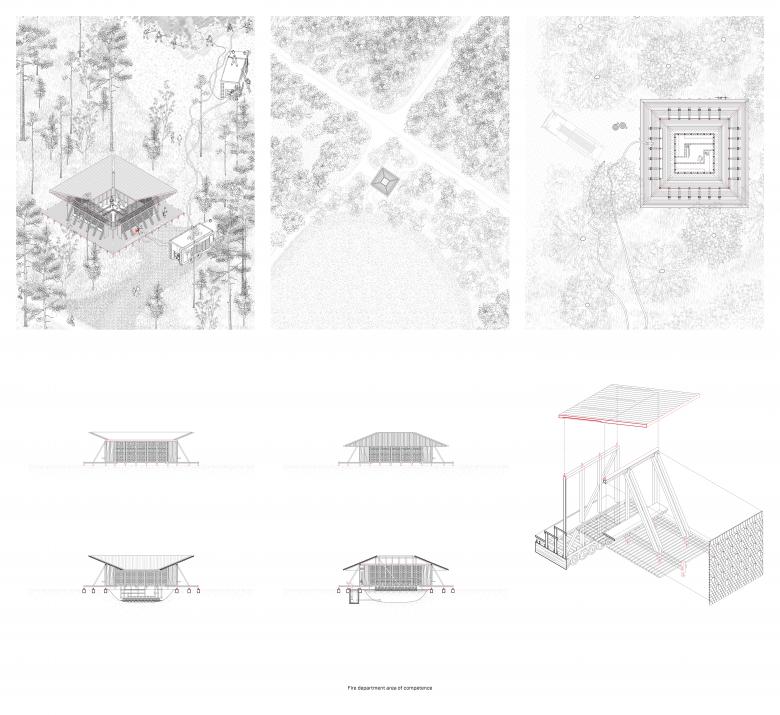 The focus of the design concept is the transformation of individual knowledge into collective knowledge, as the forest fires represent a challenge for society as a whole. Visibility and transformation of the buildings through use, time and volume are key aspects of the design and determine the appearance and functionality of the architecture. The hybridity in the designs and the constructive details themselves attempts to unite the two levels of poetry and reality of the forest habitat.