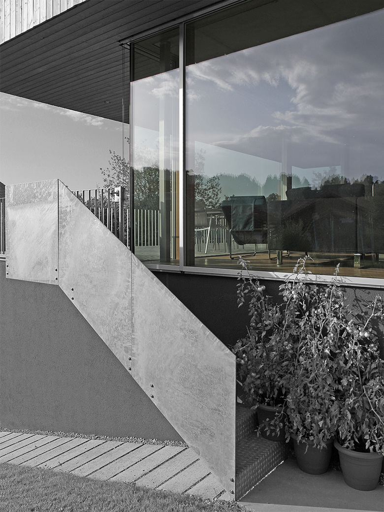 Trotz Einhaltung wesentlicher Gesichtspunkte des rigiden Bebauungsplans verkörpert das Einfamilienhaus inklusive kleiner Büroeinheit im Gegensatz zur ortsüblichen Bebauung eine eigenständige Architektursprache. Signifikante Dachüberstände nach Ost und West verleihen dem Gebäude ein plastisches Erscheinungsbild. Dieser Eindruck wird durch die homogene Verkleidung mit einer vertikalen Holzverschalung gestärkt. Um möglichst viel Grünfläche zu erhalten, wurde die Doppelgarage in die Hauskubatur integriert. Das umfangreiche Raumprogramm verteilt sich über drei Geschosse. Im Inneren ist das weitläufige Wohn- und Esszimmer der Dreh- und Angelpunkt des Hauses. Eine großzügige Über-Eck-Verglasung öffnet den Blick auf das nahe liegende Bergpanorama der bayrischen Alpen.