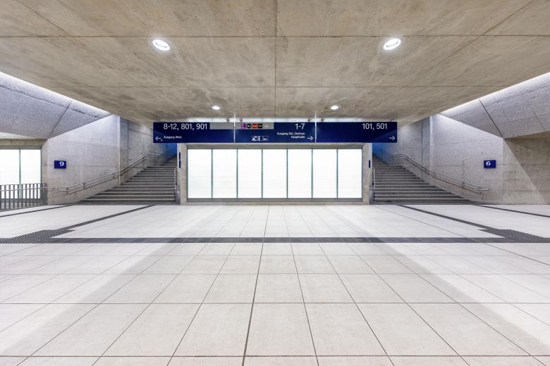 Unter den Maßgaben der Verkehrsbetriebe sieht die Lichtplanung eine Unterstützung der intuitiven Orientierung vor. Hierfür werden insbesondere Flächen-Leuchtdichten und Farbtemperaturen des Lichtes eingesetzt. In der Straßenbahnhaltestelle, zwei Etagen unter der Oberfläche gelegen, sind die Bahnsteige und Wartebereiche mit warmweißer Lichtfarbe und punktuellen Lichtquellen ausgeleuchtet. Sie sorgen für Brillanz und Plastizität. Blau hinterleuchtete Glasverkleidungen an den Wänden schaffen eine helle Raumatmosphäre und geben eine gefühlte Verbindung nach oben zum Tageslicht. Die Farbtemperaturen sind über die Verteilerebene nach oben hin bis zum Tageslicht dezent abgestuft.