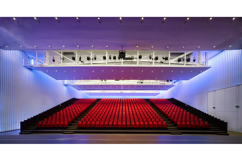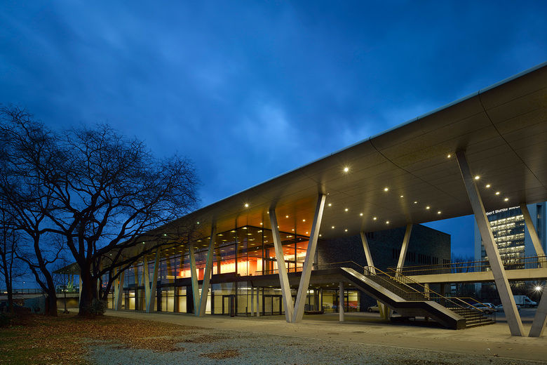 Der bestehende Klinkerbau der Messehalle blieb weitgehend erhalten. Prägend ist das neue Vordach, das sich auch über das große Foyer und einen Multifunktionssaal, umhüllt durch eine Glasfassade erstreckt. Der Zentrahle Saal befindet sich im Innern des Klinkerbaus und kann durch seine Teilbarkeit und ausfahrbare Sitztribüne unterschiedlich genutzt werden. Im Untergeschoss befinden sich ein Cafe- und Barbereich, sowie Tagungsräume.