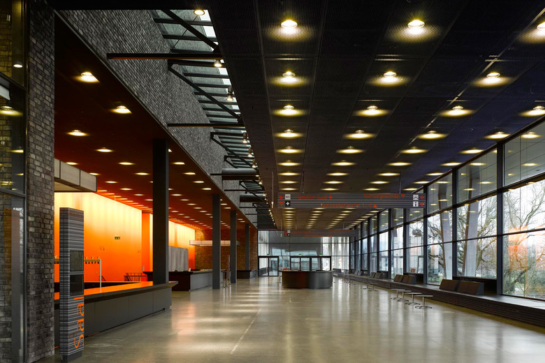 Die Decken des Foyers und Multifunktionsraumes sind mit einem Gitterrost verkleidet, welcher sämtliche Technische Einbauten verdeckt. Die Leuchten strahlen von Oben durch den Rost und werden durch die Beschaffenheit der Metallstruktur ausgeblendet. Im ausgeschalteten Zustand bleiben die Leuchten unsichtbar. Die Hell verkleidete Unterseite des Vordaches auf der Außenseite schafft ein schönes Zusammenspiel von Innen und Außen. Scheibenspiegelungen werden so reduziert und die Transparenz der Fassade bleibt erhalten. Die orangefarbene Rückwand des Foyers wird angestrahlt und hebt sich auffällig von den übrigen dunklen Oberflächen ab. Von außen betrachtet prägt die auffällige Farbe ein unikates Erscheinungsbild. Durch die Oberlichter fällt Sonnenlicht in das Foyer ein und bringt die grobe Klinkerfassade im Innenraum zur Geltung.