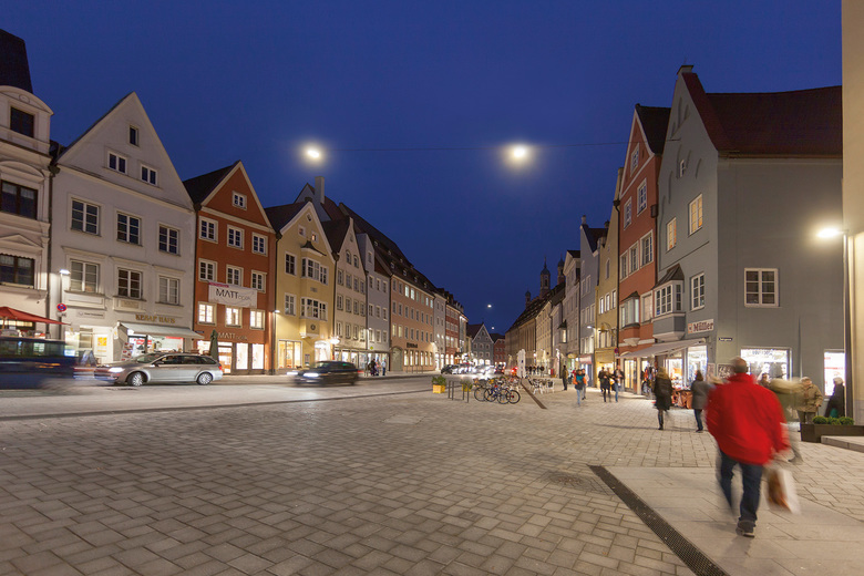 Darüber hinaus sprachen klare wirtschaftliche Vorteile für die LED-Leuchten. Im Vergleich zu konventioneller Technik mit Halogenmetalldampflampen sorgen niedrigere Anschlusswerte für Energieeinsparungen und die lange Lebensdauer der LED-Lichtquellen senkt spürbar die Wartungskosten. Durch die Möglichkeit der mehrstufigen Regelung kann der Lichtstrom bedarfsgerecht angepasst werden. Auf dem Hauptplatz in Landsberg reduzieren in die Leuchte eingebaute und ab Werk programmierte elektronische Dimmer Eco Step Dim Advanced das Niveau der Straßenbeleuchtung um 22:30 Uhr auf 75% und um 24:00 Uhr auf 50% des Ausgangswertes. Spezielle Versorgungs- und/oder Steuerleitungen sind dafür nicht notwendig.