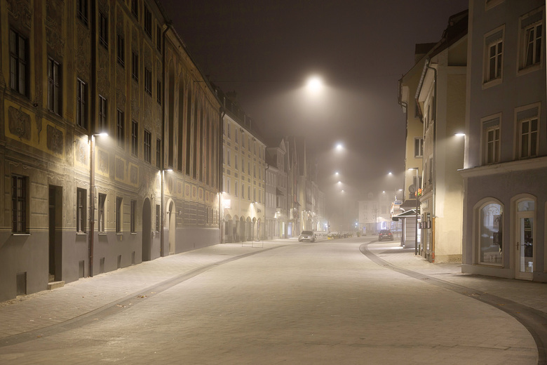 Definiert wird das Volumen des Hauptplatzes durch die geschlossene Bebauung entlang seiner Ränder. Fußwege, unmittelbar angrenzend an die Fassaden, verlaufen rund um die Platzfläche. Mast- und Wandleuchten erhellen die Gehwege und sorgen gleichzeitig für eine Aufhellung der Fassaden. Diese definierten Streiflichter auf den Häuserfronten blenden die für ein müheloses Erfassen des Raumes und eine gute Orientierung unverzichtbare Vertikale ein.