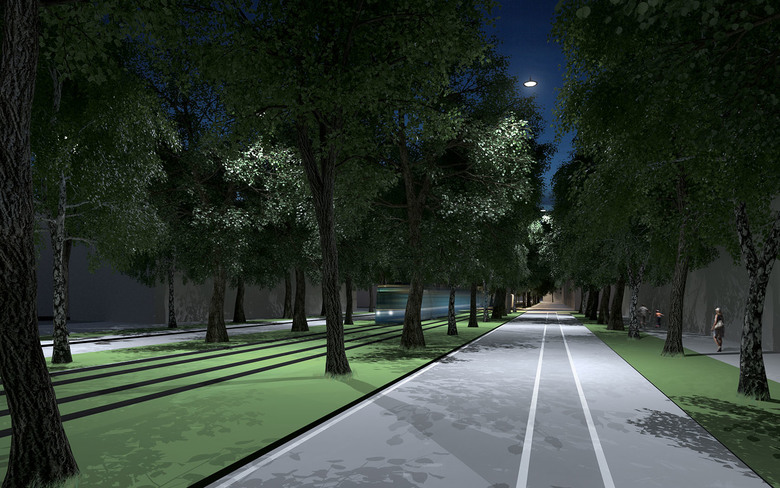 Auch der Freihamer Anger, als Fuß- und Radwegachse, trägt die Funktion einer Hauptverkehrsachse. Er hebt sich durch den Typus der Beleuchtung von den übrigen Wegen ab, wird jedoch, seinem Charakter als Anger angemessen, in Warmweiß beleuchtet.