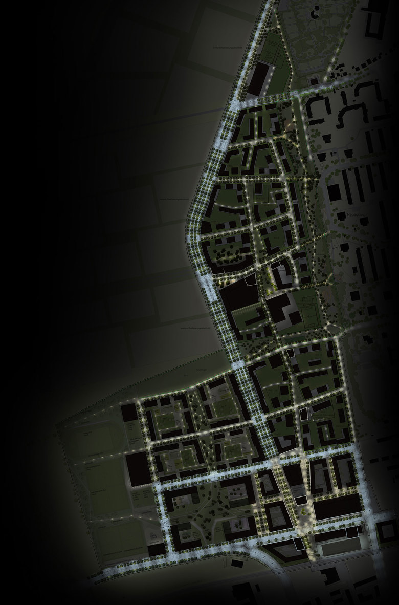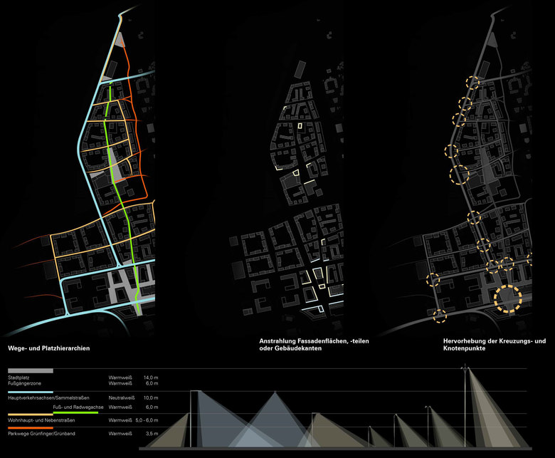 Wege- und Platzhierarchien | Die Hierarchie der Wegeführung beginnt mit zwei Hauptkategorien: Die Hauptverkehrsachsen bzw. Sammelstraßen, sowie die Wohnstraßen. Diese Unterscheidung wird durch die Charakterisierung der Beleuchtung nachgezeichnet. Große Lichtpunkthöhen, mit einer gleichmäßigen Ausleuchtung in neutralweißer Lichtfarbe, bezeichnen die Hauptverkehrsachsen. In den Wohnstraßen und auf den Plätzen wird durchgehend eine warmweiße Lichtfarbe gewählt. Außer im Stadtteilzentrum betragen die Lichtpunkthöhen dort nicht mehr als 6 m.