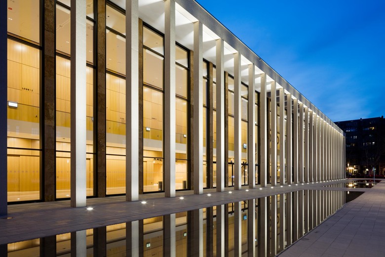 Der helle, freundliche Raumeindruck besteht auch abends weiterhin: Das Zusammenwirken der Holzoberflächen mit der Wand-Anstrahlung durch warmweißes Licht bewirkt, dass der Raumcharakter auch nach Außen hin wahrnehmbar ist. Dies unterstreicht die Transparenz des Gebäudes. Die Pfeiler der Kolonnaden, angestrahlt mit einer neutralweißen Lichtfarbe bilden in Material und Farbe einen Kontrast dazu. Sie werden dadurch als klar definierter Layer und als durchlässige Hülle ablesbar. Auf der Platzfläche wird das Fassadenbild in den Wasserflächen gespiegelt. Rasengevierte bilden eine geometrische Gliederung des Platzes, welche abends durch eine Kantenbeleuchtung dezent unterstrichen wird.