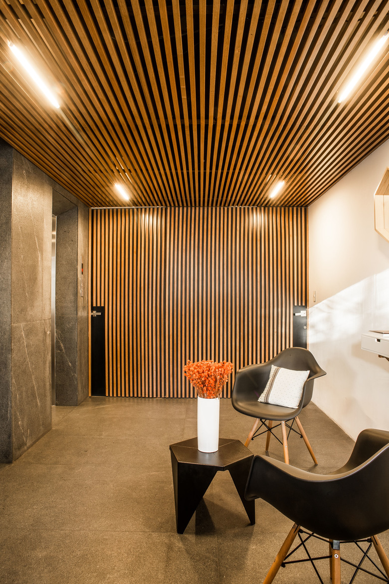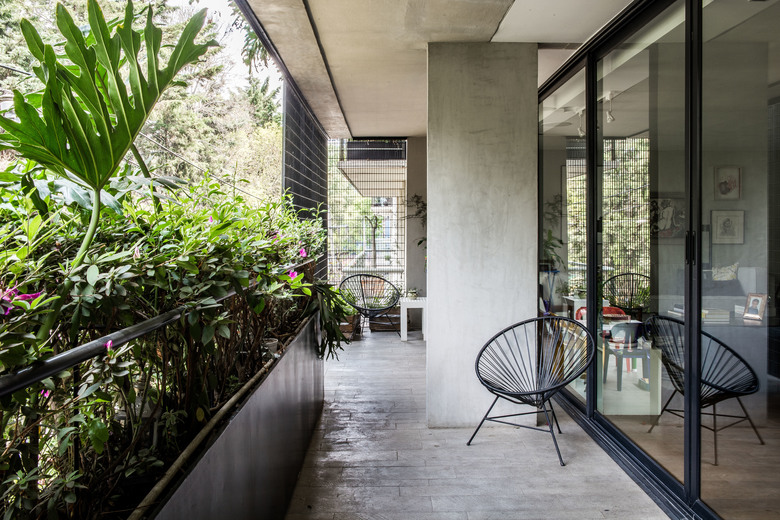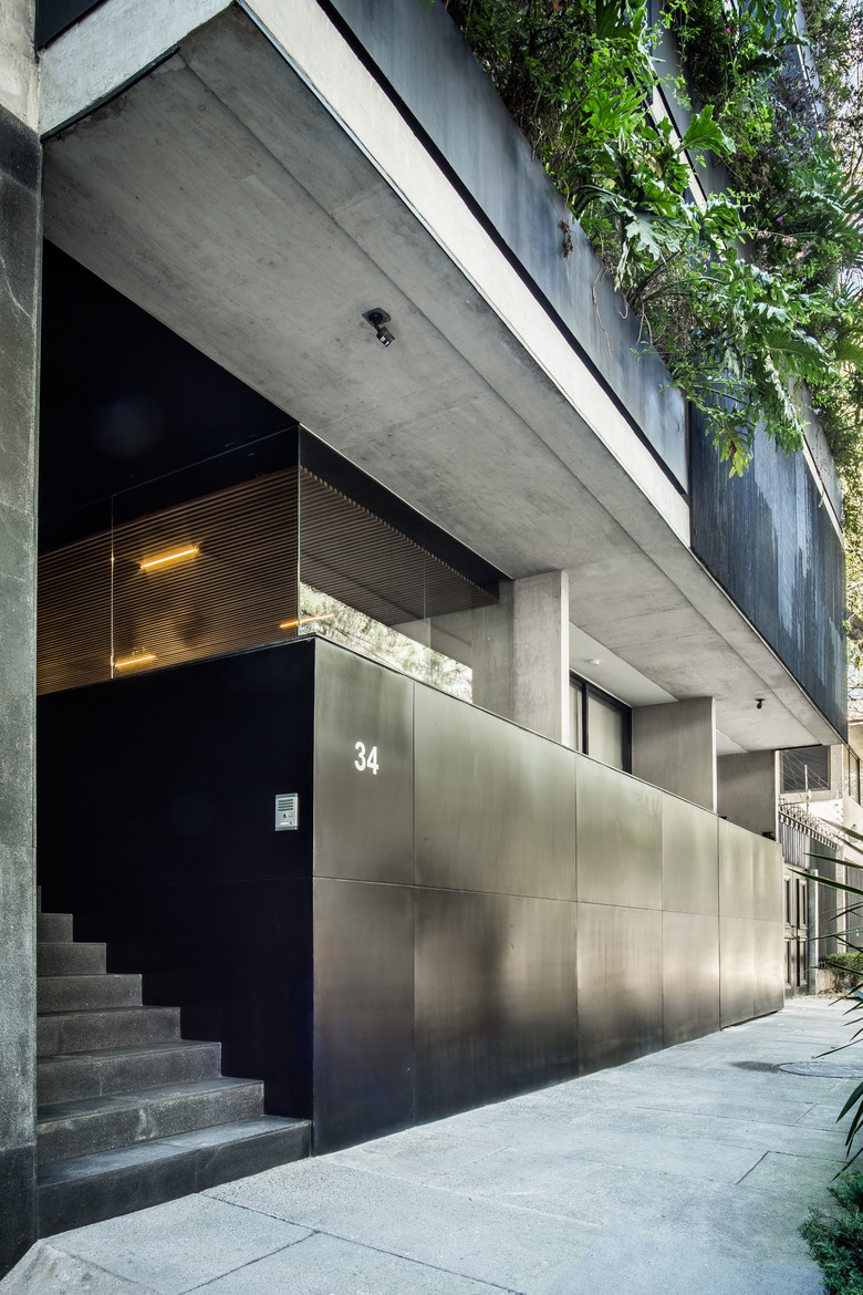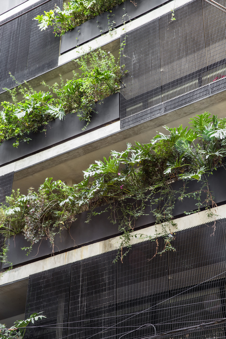 A partir del 2do nivel y los que siguen, el esquema estructural y funcional permitió generar espacios holgados que integran la zona pública con una terraza y que por medio de jardineras como elementos estéticos logran contener el área y a su vez crear una relación entre la naturaleza del contexto y la esencia del proyecto. La paleta de materiales que conforma la estética del edificio responde a la integración de 3 elementos: vegetación, luz y transparencia, de esta manera predomina el uso de concretos aparentes, acero y cancelería de aluminio con vidrio, generando una fachada con movimiento que se aleja de la uniformidad que normalmente supone un edificio de viviendas.