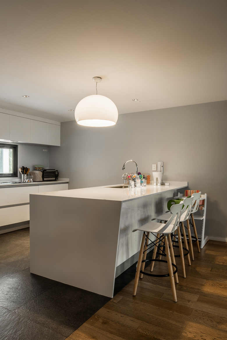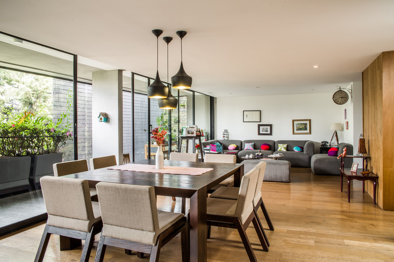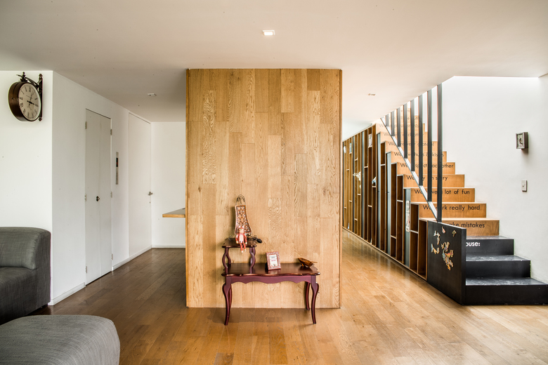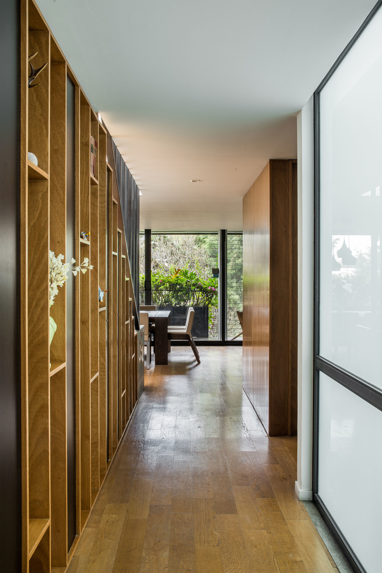 La solución del programa arquitectónico unifica 3 recámaras con baño y vestidor cada una, estancia, comedor, sala de tv, cocina, cuarto de lavado en espacios de entre 154.45 m2 y 221.51 m2. La idea de diseñar un estacionamiento “subterráneo” sin generar grandes volúmenes de excavación obligó que el acceso principal se elevará 1.40 m con relación al nivel de banqueta por medio de una escalinata, la cual desemboca en un amplio lobby en el que la combinación de madera, vidrio y materiales pétreos en tonos grises y blancos se hacen presentes. Siguiendo este diagrama, el primer departamento se ligó a la planta de acceso produciendo que la vivienda se viera reducida en su área social sin embargo se logró compensar a través de la creación de un deck descubierto en la parte posterior del terreno y un patio interior en el corazón del edificio.