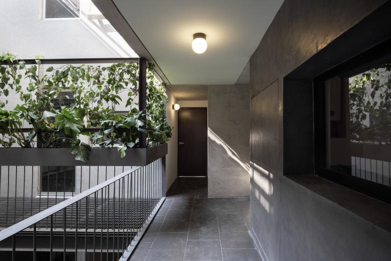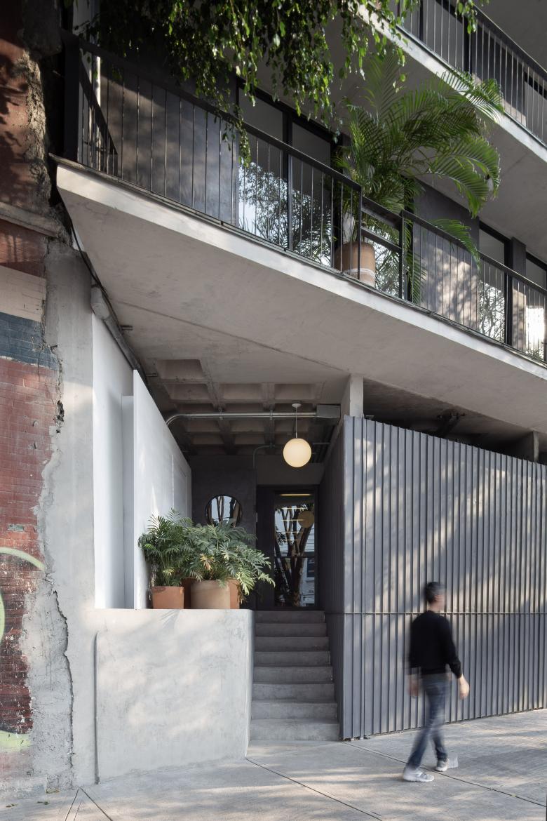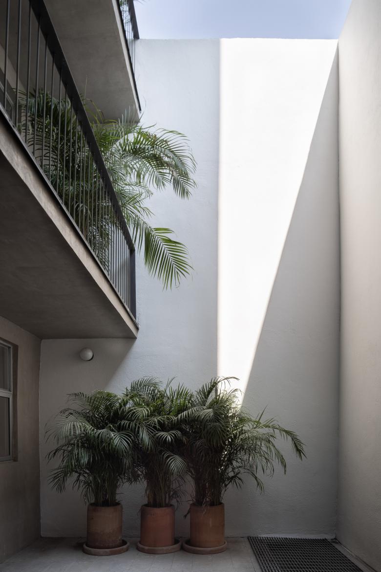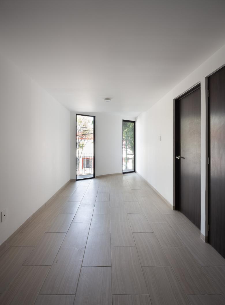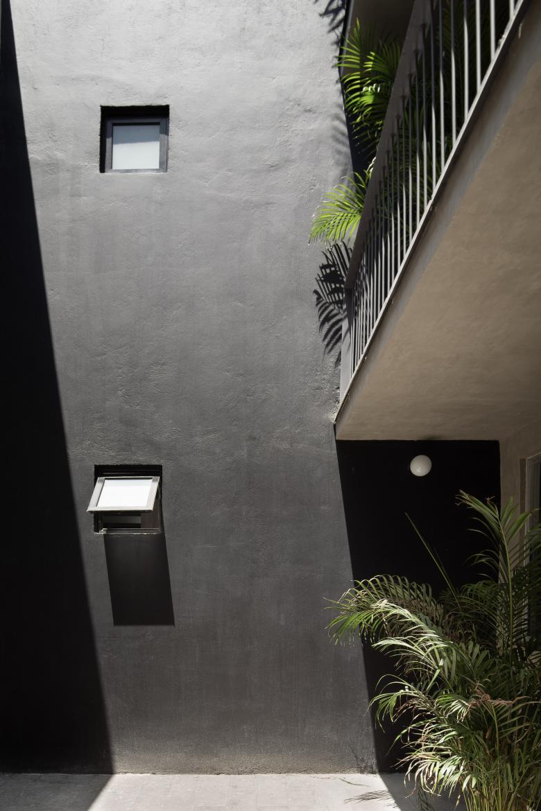 Se compone de un nivel de estacionamiento en semi sótano y otro en el primer nivel, así como 6 niveles más con 12 departamentos en total.