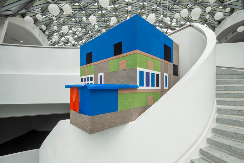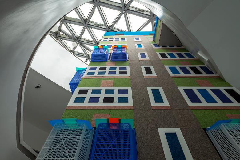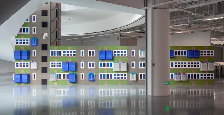 A site-specific installation to reproduce a typical Chongqing apartment building on the scale of 1:4 with everyday objects, e.g. carpet, felt, plastic sheets, and plastic baskets.