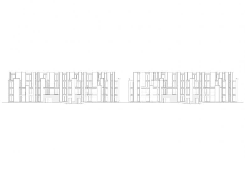 Das Grundstück befindet sich im Gebiet Lacheren am nördlichen Rand der Stadt Schlieren. Das Quartier ist geprägt durch zwei- bis dreigeschossige Wohnbauten. Die beiden Ersatzneubauten für 35 Wohnungen integrieren sich in die vorgefunden Körnung des Quartiers und gliedern sich harmonisch in die bestehende nördliche Bebauung ein. Aufgrund der städtebaulichen Setzung hat fast jede Wohnung zwei Seiten mit maximal unterschiedlichem Charakter: einerseits der stark strukturierte, härtere Rücken zur Limmatstrasse, andererseits die ruhige Seite zum Hofraum. Das Raumgefüge löst sich mittels Wandscheiben geometrisch in freie Formen auf, während die Individualzimmer rechtwinklig und statisch bleiben. Der architektonische Ausdruck des Gebäudes manifestiert sich in der Dualität der Fassaden: Die Strassenfassade ist im Kompaktsystem mit durchlaufenden Bändern ausgeführt. Durch die leicht goldig schimmernden Glasstreifen entsteht ein subtiles Spiel mit klassischen Themen der horizontalen Fassadengliederung. Analog zu den horizontalen Elementen auf der Nordseite sind die vertikalen Gliederungselemente mit goldenem Flies hinterlegten Scheiben materialisiert. Diese dienen einerseits der solaren Energiegewinnung aber vor allem sind sie gestalterische Elemente, welche je Lichteinfall bei jeder Tages und Jahreszeit den Hof in andere Stimmungen versetzen.