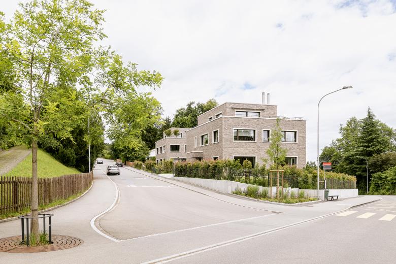 Durch die Grundstücksarrondierung und dem frei werdenden Parkplatzbereich der Strassenparzelle entsteht ein neues Baufeld. Mit der Überbauung Sonnenhaldenstrasse sind zwei Neubauten geplant, die sich mit einem quartiersüblichen Strassenabstand an der Goethestrasse orientieren. Im südlichen Bereich ist das private Einfamilienhaus, im nördlichen Bereich ein Mehrfamilienhaus mit sechs Eigentumswohnungen geplant. Die beiden Bauten sind durch die gemeinsame Tiefgarage miteinander verbunden, deren Einfahrt von der Sonnenhaldenstrasse erfolgt. Die Neubauten werden in Massivbauweise mit einer hinterlüfteten Klinkerfassade in erdigen Farbtönen erstellt. Der grosse Garten wird durch eine Bepflanzung mit Sträuchern zur Strasse abgeschlossen. Die durchfliessende Landschaft bettet die beiden Punktbauten in den Grünraum ein so, dass die Volumen im Strassenbild zurücktreten.
