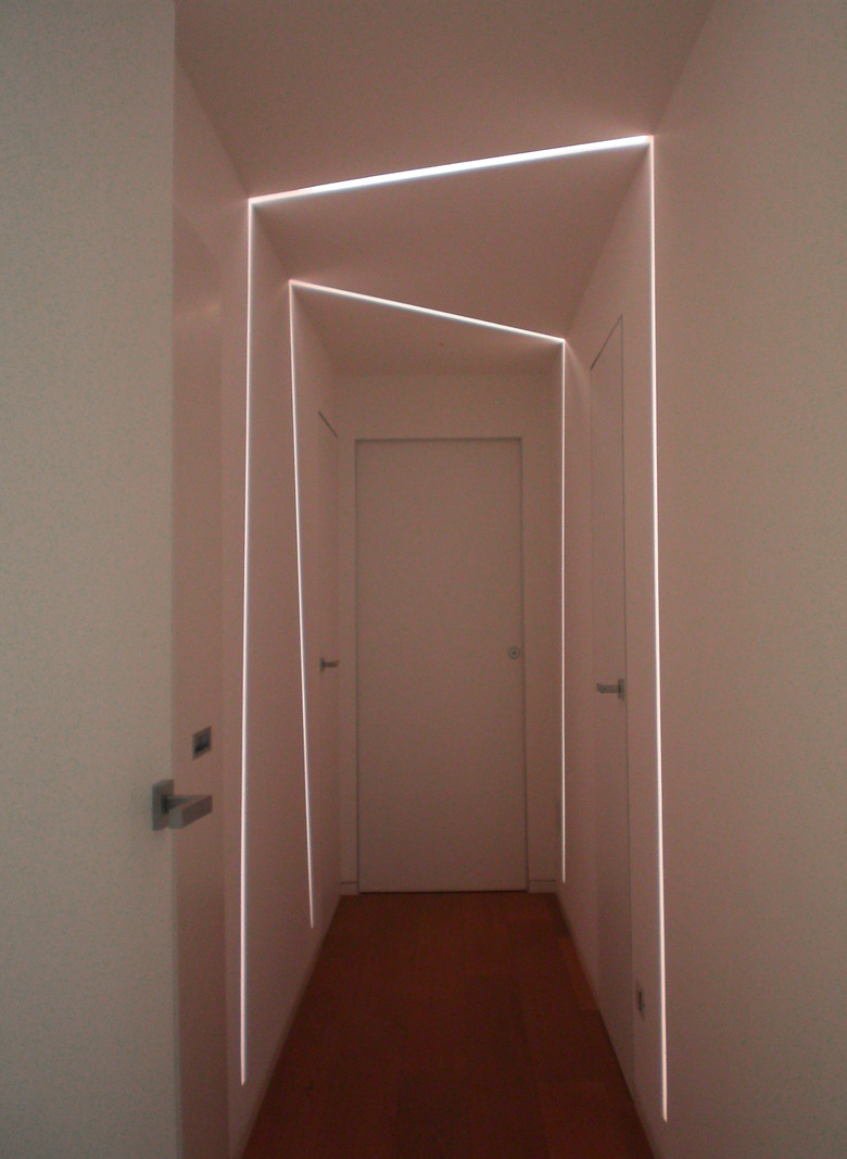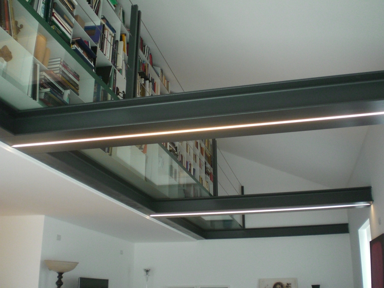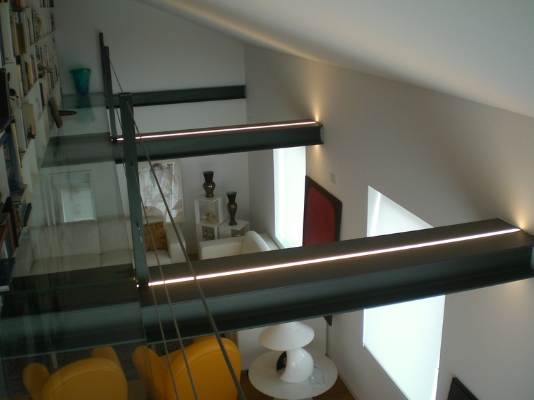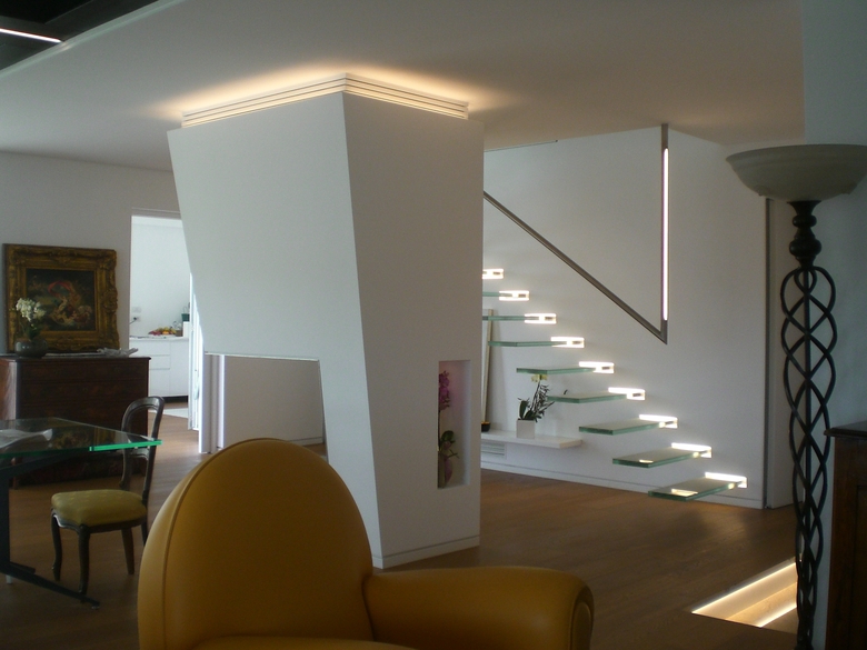 LND apartment design is the refurbishment of a prestigious apartment in the medieval centre of Padua. The design has modified the interior space creating a wide double-height living room. Every detail of the apartment has been carefully designed integrating lighting system to create a refined effect. The interior space has been maximised to divide house different functions and to guarantee to every room a more rational space. The entrance is highlighted by a glass staircaise whose steps climb to the upper floor apparently with no support and their lightness is emphasised by spot lights in correspondence with the wall joints. A fireplace, integated in a prismatic volume, divides the entrace from the living room whose double-height has been used to create a bookcase at the upper level. The bookcase glass boardwalk is sustained by black metallic beams with integrted lights. The floor plans have been modified to integrate the apartment’s wide terraces, to create a connection between inside and outside spaces.