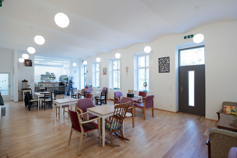 Ehrenamtliche HelferInnen und SozialarbeiterInnen kümmern sich rund um die Uhr um die Bedürfnisse der 24 Bewohner, die seit November 2018 ein unbefristetes, bedingungsloses Heim gefunden haben, das sie annehmen und ihren Möglichkeiten gemäß bewohnen können.