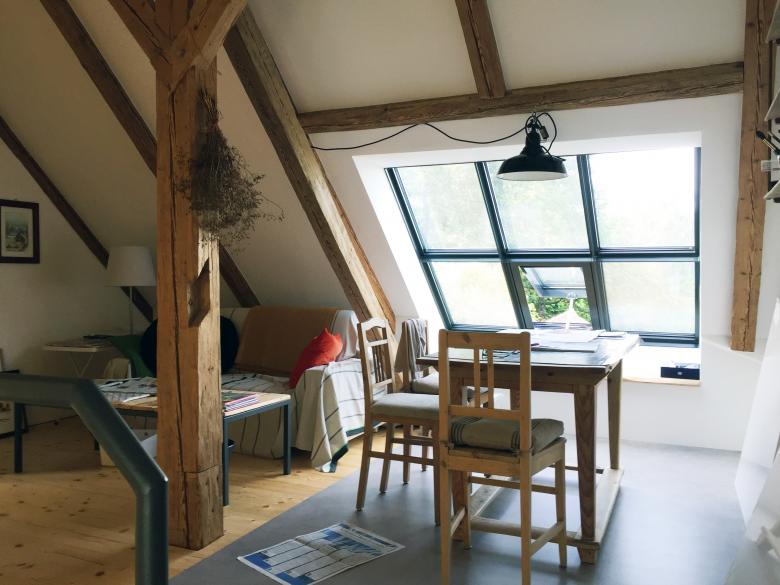 die holzkonstruktion der zwischendecken und des dachstuhls hingegen hatte die bisherige lebensdauer hervorragend überstanden und mußte nur an wenigen stellen für den neuen ausbau ertüchtigt werden. daher konnte sie in großem umfang sichtbar bleiben.