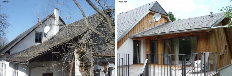 der hinterlüftete neue dachaufbau wurde mit einer sparrenaufdoppelung hergestellt, zwischen deren neuen schalungen die wärmedämmung eingeblasen wurde.