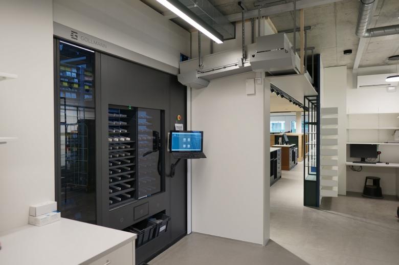 Ein Medikamenten-Automat mit Förderbändern und vier im Verkaufsbereich verteilten Ausgabestellen wurden ebenfalls eingeplant. Damit die Kunden und Kundinnen nach Ladenschluss ihre Artikel abholen können, wurde zudem eine Abholstation mit Anbindung an den Automaten in der Fassade ergänzt.