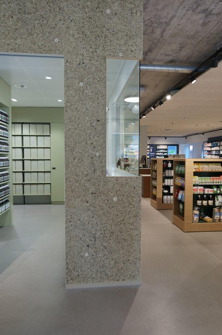 Gegenüber befindet sich das Spagyrik-Labor mit Einblick in die Herstellung. Die Laborwände sind mit einer organischen Naturoberfläche aus Stroh und Margeriten überzogen. Der gesamte Vorderteil der Apotheke vermittelt ein naturnahes Erlebnis für die Gesundheitsförderung. Im hinteren Bereich der Apotheke befinden sich die Medikamente mit einem dunkelblauen Hintergrund und einer weissen Umgebung, um die seriöse Beratung an den Tresen zu gewährleisten. Dazu in unmittelbarer Nähe die grosszügig gestalteten Beratungsräume in zarten grünen und gelben Pastellfarben.