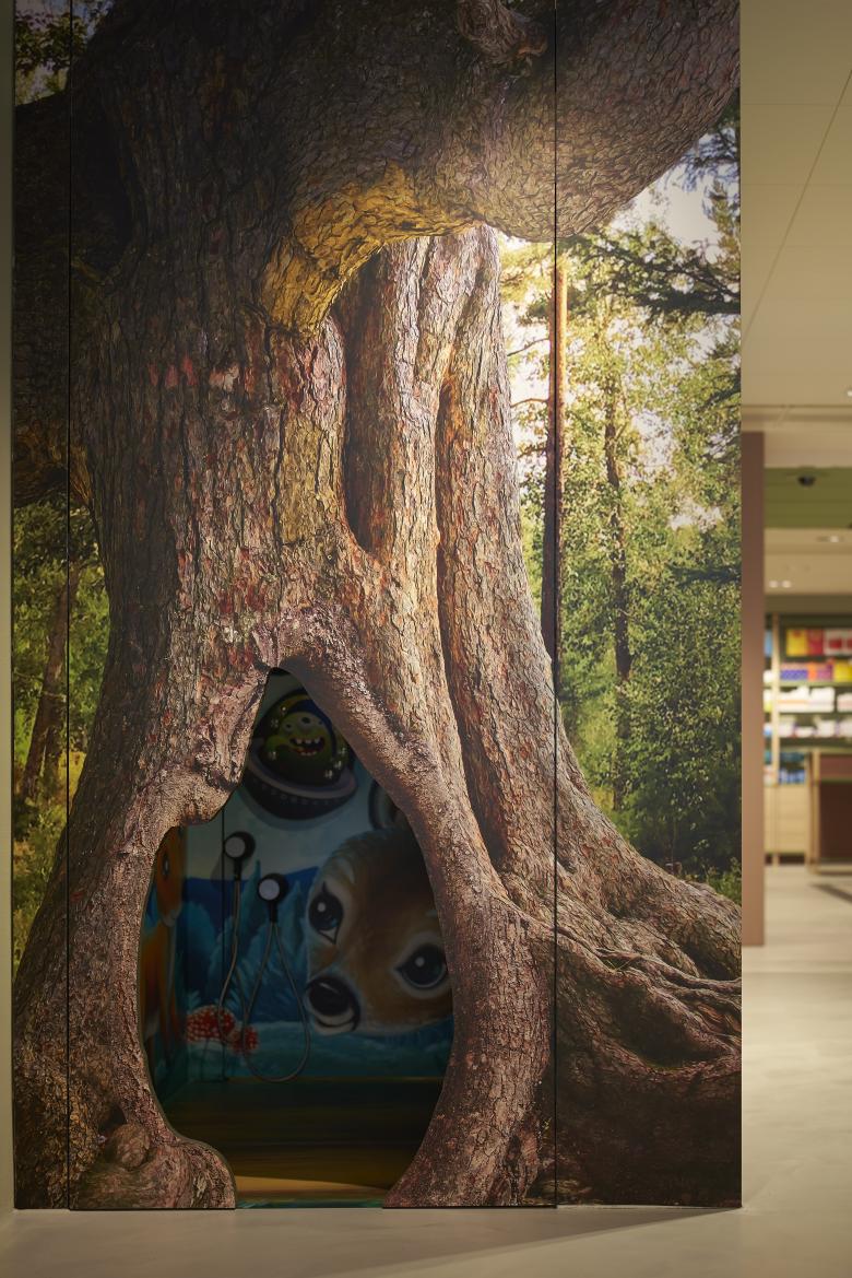 Unter der Treppe zum 1. Obergeschoss bot sich sogar Platz für eine Kinderecke an. Das Thema Natur wurde als geheimnisvolle Baumhöhle aufgenommen, wo Kinder während des Einkaufs die Möglichkeit haben, in einen Baum hineinzukriechen, um eine Fantasiewelt zu erleben und Märchengeschichten zu lauschen.