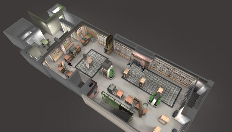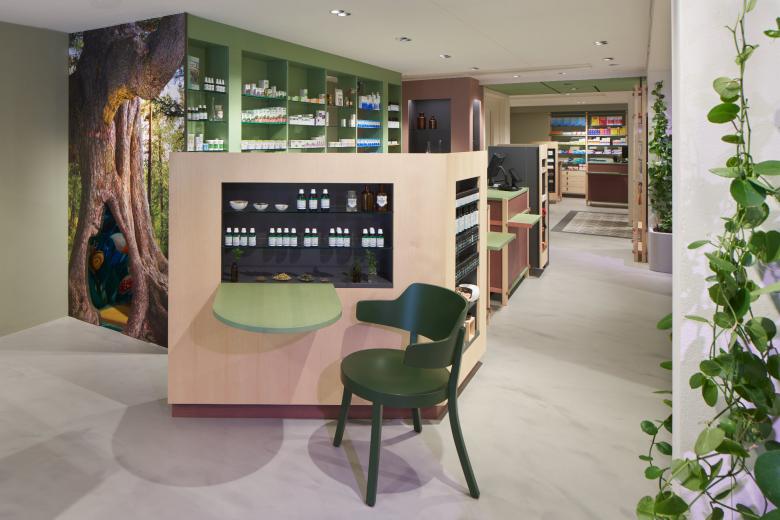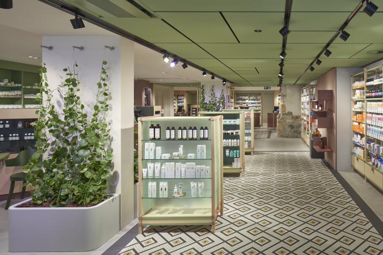 Pflanzgefässe aus demselben Material wie der gespachtelte Bodenbelag sind in der Innenarchitektur integriert, und die auf Stahlseile aufgebundene Kletterpflanzen vermitteln eine wohnliche Atmosphäre. Für die Warenpräsentation wurden die Regale «Nexus» von «Piade» aus Massivholzverbindungen in der Kombination Esche natur mit gedämpftem Rot und Grün eingesetzt. Dazu Bereiche in warmen Brauntönen an den Korpusfronten kombiniert.