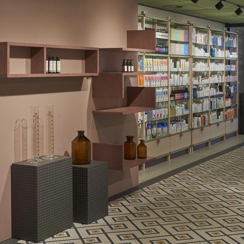 In Murten kann man vielerorts verschiedenste historische Fliesen beobachten, typisch in Mustern verbaut und angeordnet. Mittels dieser Inspiration wurde ein Mosaik aus Feinsteinzeug ausgewählt und dient nun in der Apotheke als «Eingangsteppich», als Willkommensgruss, und um den hinteren Kassenbereich zu betonen.