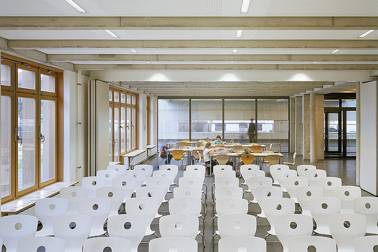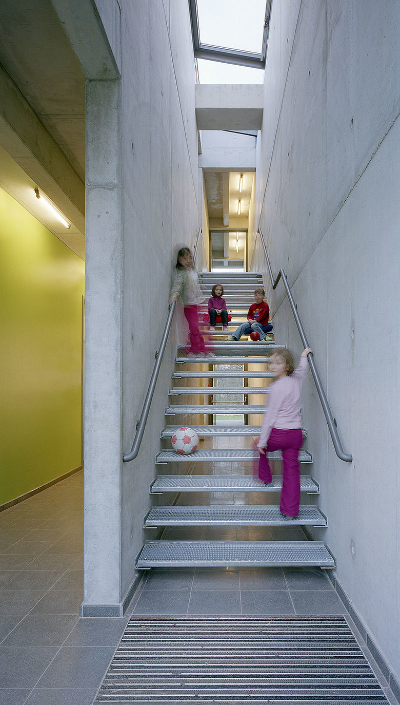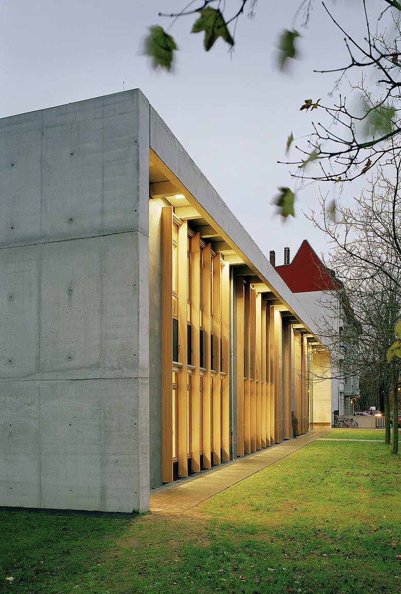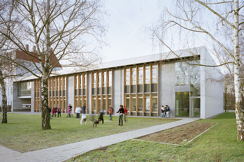 Unter einem festen schützenden Dach aus Sichtbeton bietet der Neubau viel Raum für die Erweiterung der Birken-Grundschule und der Schule am Grüngürtel zu offenen Ganztagsschulen mit 155 Plätzen. Das zweigeschossige Gebäude im Berliner Stadtbezirk Spandau (Gesamtbaukosten etwa 2,2 Mio €) wurde aus Mitteln des Programms „Zukunft Bildung und Betreuung“ IZBB und des „Europäischen Fonds für regionale Entwicklung EFRE finanziert. In die Straßenflucht einer Gründerzeitfassade platziert, vermittelt der Baukörper zwischen der Blockrandbebauung im Süden und einer offenen Bebauungsstruktur mit 4-geschossigen Wohnhäusern aus den 50-iger Jahren im Norden. Im Rahmen der Maßnahme wurden auch die weitläufigen Sport- und Erholungsflächen im Inneren des heterogenen städtischen Großblocks neu geordnet.