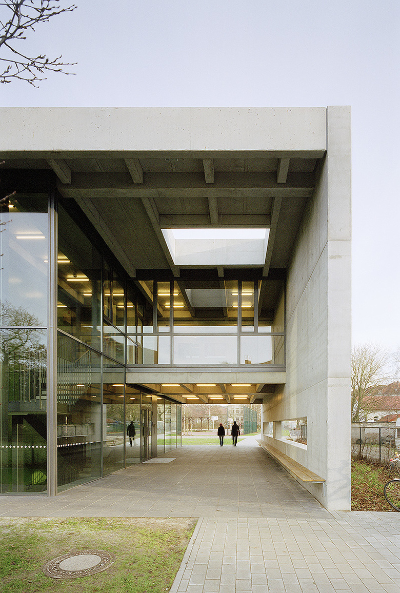 Eine zweigeschossigen Arkade markiert den Haupteingang auf dem Verbindungsweg zwischen beiden Schulen Dieser Ort mit einer Sitzbank aus Holz ist der ideale Treffpunkt für wartende Eltern, Kinder und Erzieher. Die offene, einladende Geste der Arkade verstärkt das auskragende Dach mit filigranen Balken aus Sichtbeton. Das kühle Material Sichtbeton kontrastiert mit vom Boden bis zum Dach spannenden Holzlamellen.