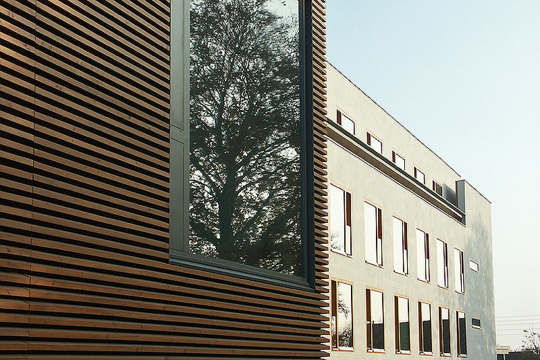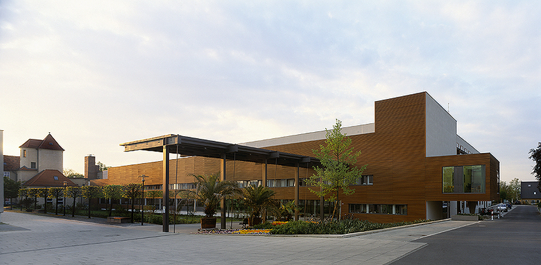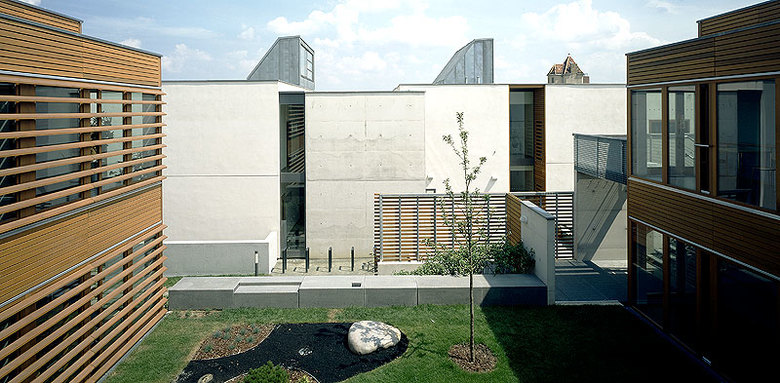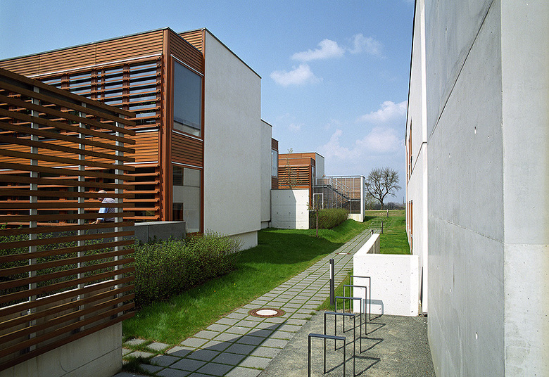 Die Abteilung für Psychiatrie liegt eingebettet in den Abhang des Falkenbergs im nördlichen Bereich des Krankenhausareals. Die Patienten sind in paarweise miteinander verknüpften Pavillons untergebracht, die gegeneinander versetzt eine "weiche Linie" zum offenen Landschaftsraum bilden. In ihrer Maßstäblichkeit orientieren sich die Gebäude an den Wohnhäusern der benachbarten Gartenstadt Falkenberg. Über die Putzfassade mit außenbündig eingefügten französischen Fenstern sind die Pavillons auch in Ihrer Materialität in die benachbarte Bebauung eingebunden. Großzügige transparente Holz- Glas-Fassadenelemente ermöglichen Einblicke in die geschützten, wohnlichen Innenhöfe.