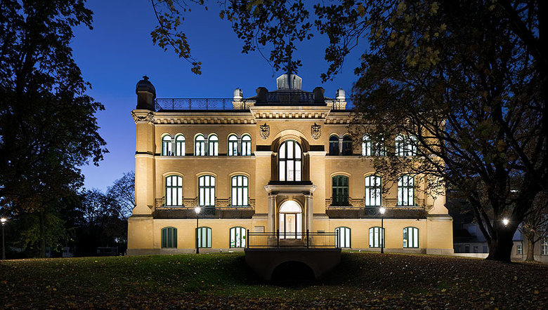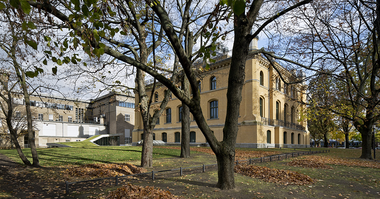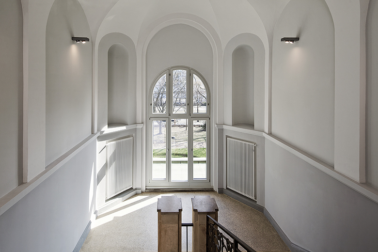 Die Blicke öffnen sich über den geneigten Innenhof zum Observatorium und in die Bäume des „physikalischen Parks“.