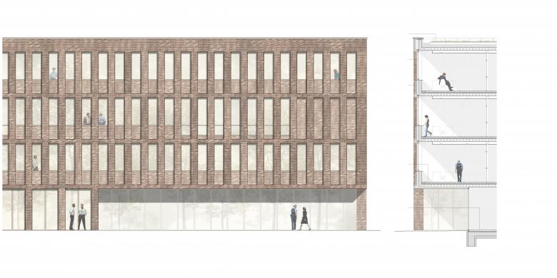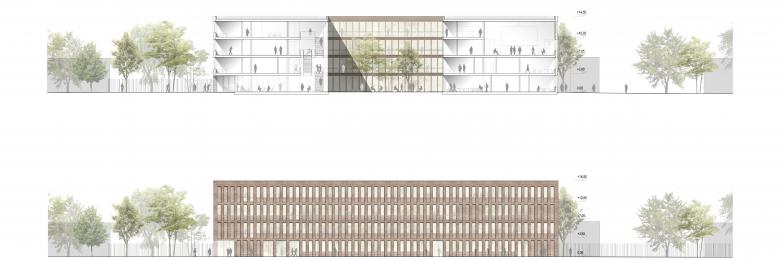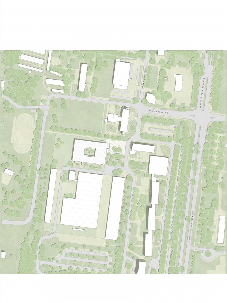 Der viergeschossige Solitärbaukörper fügt sich als neuartiger Stadtbaustein maßstäblich gut in die bestehende Stadtstruktur ein, der Innenhof bietet Tageslicht und Orientierung. Gebäude, Vorplatz und Innenhof leisten mit der direkten Anbindung an die Kirschenallee einen starken Beitrag für die Neuordnung des gesamten Areals, dem bisher eine raumbildende Idee fehlte. Die Eingangs-Loggia an der Nordostecke des Gebäudes signalisiert in Richtung Neustrelitzer Straße deutlich den Haupteingang. Dem öffentlichen Charakter des Vorplatzes entsprechend befindet sich hier die öffentlich zugängliche Kantine mit Außensitzplätzen. Die belebte Terrasse lädt auch die Mitarbeiter und Besucher des benachbarten Finanzamts und Bewohner, Besucher und Mitarbeiter des Altenhilfezentrums zum Verweilen ein.