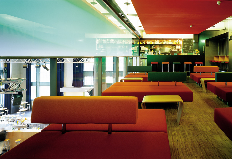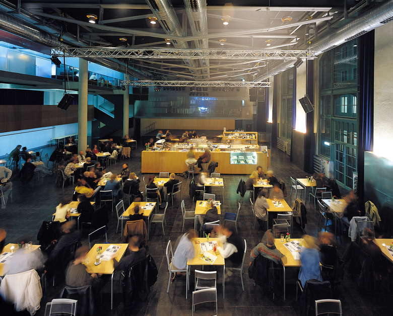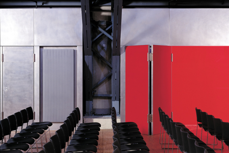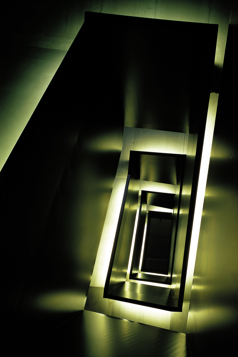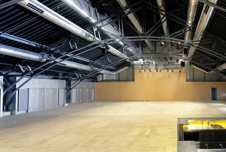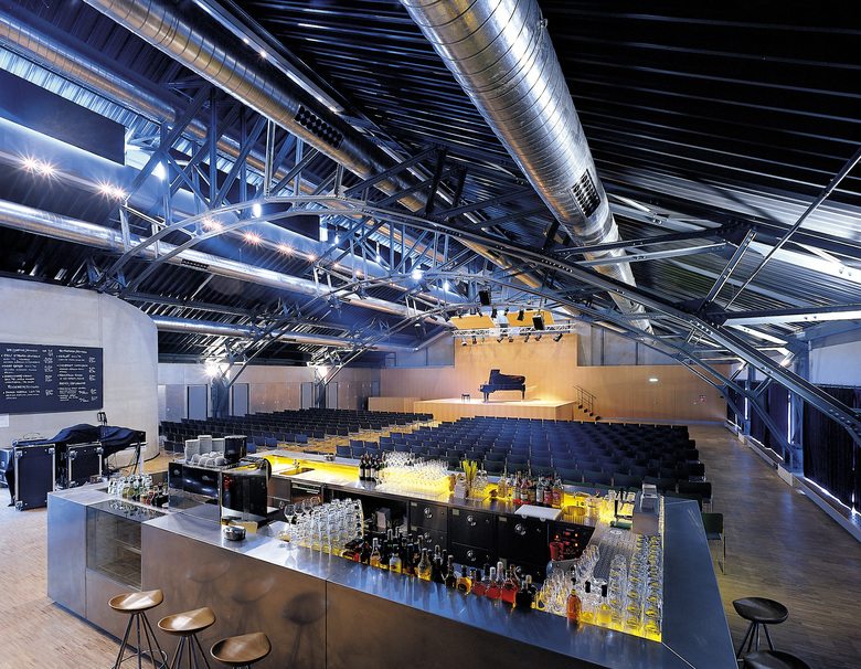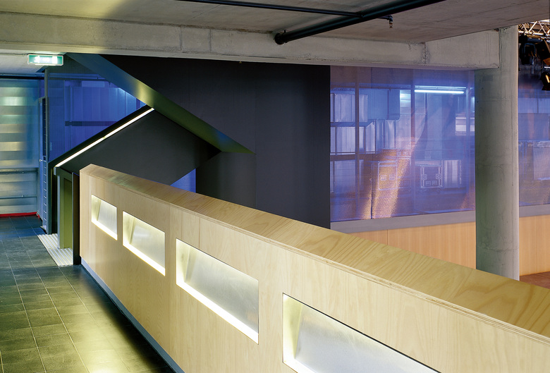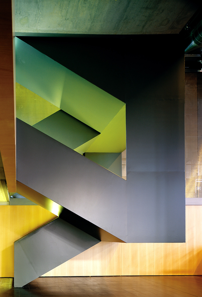 Dem sich ständig wandelnden Kulturbetrieb wurden architektonisch Ruhe und Klarheit entgegengesetzt. Vom Erdgeschoss aus gelangt man intern über eine abgehängte, »gefaltete« Stahltreppe auf die beiden Galerien. Sie besteht aus vier Millimeter dickem, zusammengeschweißtem Stahlblech und beherbergt verdeckte Leuchtstoffröhren zur indirekten Beleuchtung des Treppenkörpers.